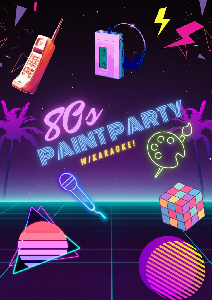 All the nostalgia! Paint your favorite 80s icons while while we listen to the best hits of the 80s! Have fun with neon paint to make your nostalgic masterpiece come to life. Karaoke is also available for anyone who wants to sing their heart out.