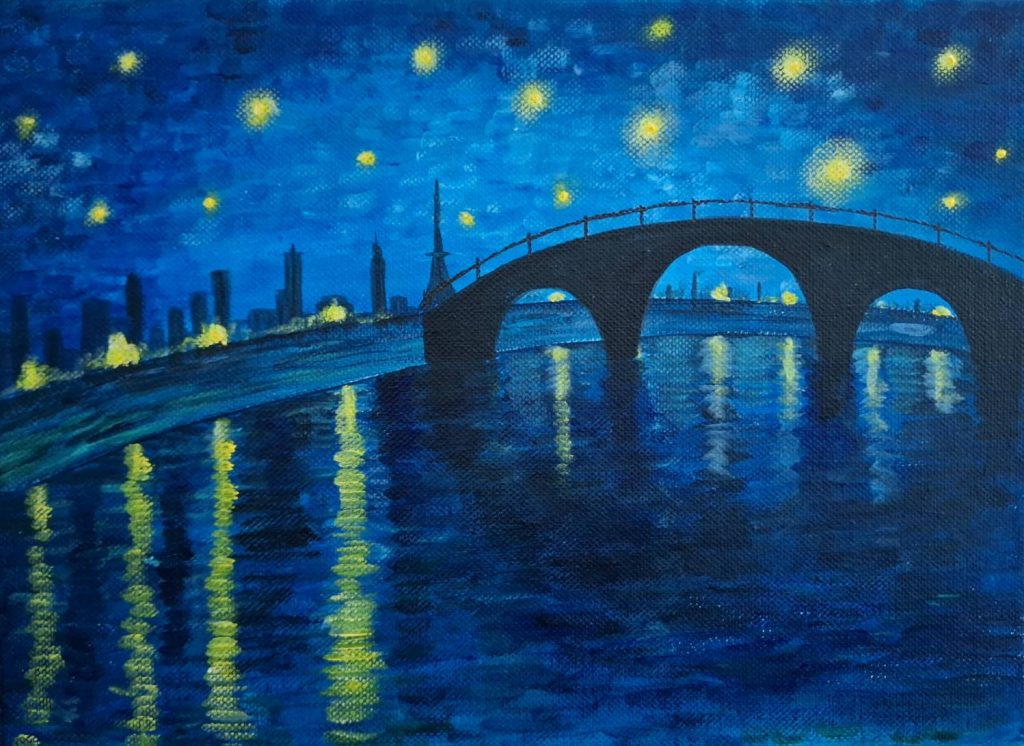 親子セッション!日本橋の星月夜 日本橋三越本店で新春親子セッションを開催します!ゴッホの代表作、ローヌ川の星月夜を日本橋バージョンにアレンジしたアートを描きます。ステンシルを使用したユニークな画法にも挑戦できます。