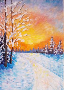 このクラスでは、雪に包まれた静かな道、凛と立つ木々、そして心が温まる夕焼けの空をアクリル絵の具を使ってキャンバスに描きます。