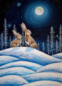 このクラスでは、幻想的な冬の夜をテーマに、アクリル絵の具で 満月に照らされた静かな雪原と野うさぎの世界をキャンバスに描きます。