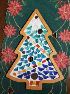 - In this class we will use 25cm tall wooden Christmas tree plate, mosaic tile and small mirrors.