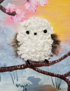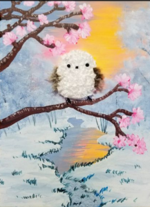 In this class, we will paint a snowy landscape and use fluffy materials to add texture to the fluffy warm feathers on the egret.