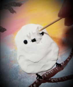 子供たちはミクストメディアを使って作品を作ります。アクリル絵の具で背景を作り、本物のボタンを使って自分だけのツリーを飾り付けます。